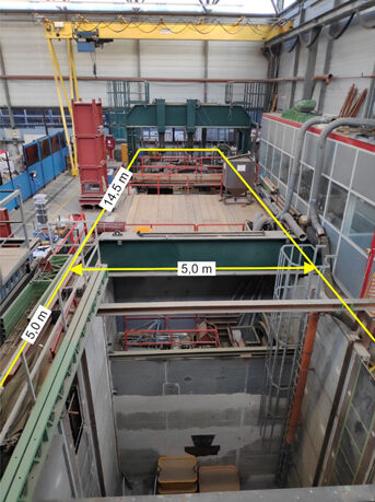 Located in a 23 m x 23 m x 7 m (L x W x H) experimental hall of the Institute of Geotechnics, GTP has a total length and width of 19.5 m and 5 m, respectively. It consists of a stiff concrete box caisson, the lateral and bottom boundaries of which are rigid. It has two parts: a 6 m deep pit with plan dimension of 5 m x 4.35 m and a shallower pit 3 m in depth and plan dimension of 14.5 m x 5 m. In the latter pit, mobile walls can create smaller sections to allow for smaller-scale tests. In addition, a 4.3 m x 3 m (diameter x height) steel cylinder is available that has water connections at the bottom and thus where saturated testing can be performed.